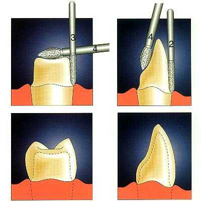 Затем сошлифовывают режущий край или жевательную поверхность на 1.5-2.0мм. После этого снимают слой эмали и дентина со щечной или небной стороны на 0.5-1.0мм так, чтобы на уровне десневого края образовался уступ.