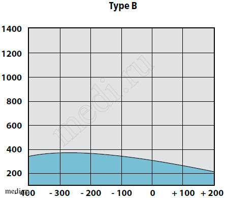 У детей с секреторной стадией ЭСО при отоскопии определяются утолщение барабанной перепонки, ее втяжение в верхних отделах, иногда с цианотичным оттенком, выбухание в нижних квадрантах. На аудио-грамме выявляется повышение порогов воздушного звукопроведения до 20-40 дБ. При акустической импедансометрии всегда определяли тип «В» и отсутствие акустических рефлексов (рис. 2).