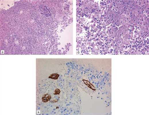 Рис. 6. Больной № 3. Разрыв кисты кармана Ратке. Ксантоматозный некротизирующий гипофизит. а — некротизированные массы с фрагментом эпителиальной выстилки кисты кармана Ратке; окраска гематоксилином и эозином, ×200; б — полиморфно-клеточный инфильтрат; окраска гематоксилином и эозином, ×400; в — CD68+-ксантомные клетки, ×400.