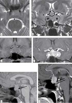 Рис. 4. Больной № 1. Т2-ВИ гипофиза в аксиальной (а) и фронтальной (б) плоскости. Железа увеличена в размерах в параселлярном и супраселлярном направлениях, Утолщена воронка (обозначена кружком). На фоне среднеинтенсивного сигнала выявляется локальная зона отека (обозначена стрелкой). Сифоны внутренней сонной артерии интактны. Т1-ВИ гипофиза во фронтальной плоскости до (в) и после (г) внутривенного контрастного усиления. Сигнал от пораженной железы достаточно гомогенный, среднеинтенсивный. Отмечается интенсивное гомогенное контрастирование ткани гипофиза. Сифоны внутренней сонной артерии интактны. Т1-ВИ в сагиттальной плоскости до (д) и после (е) внутривенного контрастирования. До контрастирования визуализируются выраженный супраселлярный тип роста железы, отсутствие типичного высокоинтенсивного сигнала от нейрогипофиза (указано стрелкой). На постконтрастном изображении отмечается равномерное контрастное усиление железой и наличие контрастного усиления по утолщенной менингеальной оболочке вдоль ската основной кости (указаны желтыми стрелками), а также контрастированные менингеальные «усики» (указаны красными стрелками) или феномен «dural tail».