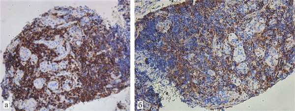 Рис. 3. Больная № 6. а — островки оставшихся нейроэндокринных клеток, окруженных CD3+-Т-лимфоцитами, ×200; б — диффузная экспрессия HLA-DR, ×200.