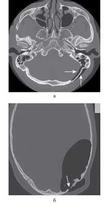 Рис. 2. Компьютерная томография височных костей пациента Ш., аксиальная проекция, костное окно. а — выраженная гиперпневматизация клеток правой височной кости с истончением ее кортикального слоя, воздушная полость отпределяется интракраниально по заднему контуру правого сигмовидного синуса; б — подкожная эмфизема в височно-теменной области (стрелка).