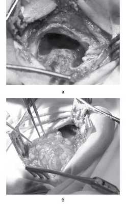 Рис. 4. Интраоперационные фотографии. а — полость после расширенной антромастоидотомии со скелетированным сигмовидным синусом; б — облитерация созданной полости подкожно-жировой клетчаткой.