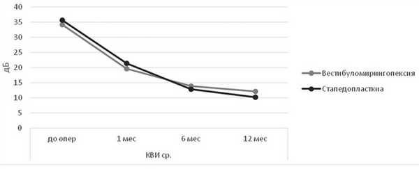 Рис. 5. Диаграмма динамики усредненного КВИ в обеих группах больных тимпаносклерозом. То есть инструментальная стапедопластика была эффективна во всех сроках наблюдения, но лучшие результаты отмечены через 1 год после операции. КВИ