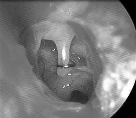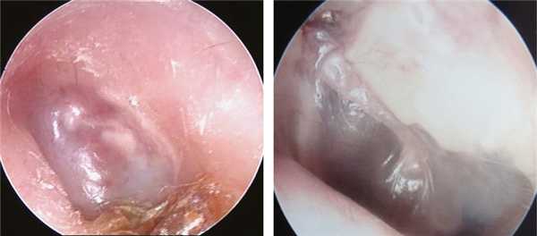 Рис. 1. Эндофотография барабанных перепонок у больных тимпаносклерозом перед стапедопластикой.