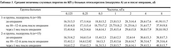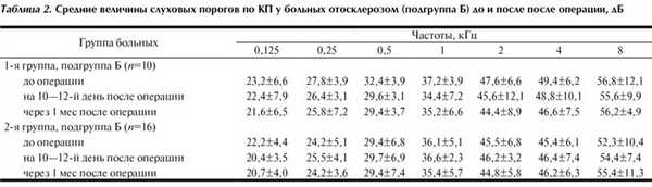 Из показателей, приведенных в табл. 1, видно, что средние величины слуховых порогов по КП у больных подгрупп А обеих групп как до операции, так и в разные сроки после нее статистически достоверно (р≤0,05) не изменились и у больных разных групп практически не отличались.