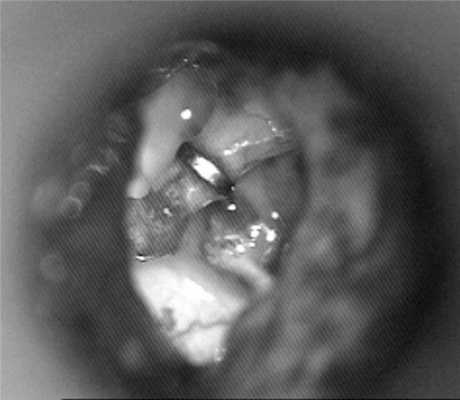 В дальнейшем в этой области развился рубцовый процесс, что привело к сращению жировой ткани с лентикулярным отростком и вызвало его смещение во внутреннее ухо. При ревизии осмотру была доступна только петля протеза, а его ножка полностью скрыта в рубце (рис. 4). Рисунок 4. Интраоперационное фото. Смещение стапедиального протеза во внутренне ухо.