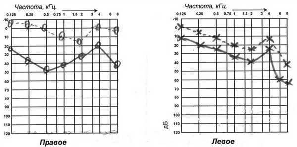 В дальнейшем контроль слуха проводился 1 раз в месяц. На серии аудиометрий отмечается костно-воздушный интервал, имеющий тенденцию к уменьшению, который связан, по-видимому, с подвывихом наковальни во время ее латерализации.