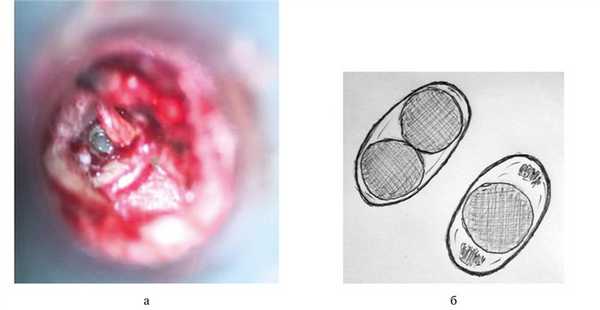 Рис. 6. Формирование лазерного отверстия в основании стремени. а — микрофотография созданного отверстия (диаметром 1 мм) в основании стремени; б — схема формирования отверстий с помощью лазера. Отверстие в подножной пластинке стремени с одного импульса сформировано в 7 случаях, а в 18 — потребовалось от 2 до 20 (в среднем 4,3±1,2) импульсов в связи с толстым и плотным основанием стремени, обусловленным тимпаносклеротическим процессом. Вестибуломирингопексия проведена у 16 больных (на первом этапе у 6, на втором — у 9 и на третьем — у 1). Вестибулоинкудопексия выполнена у 9 пациентов (на первом этапе у 3 и на втором — у 6).