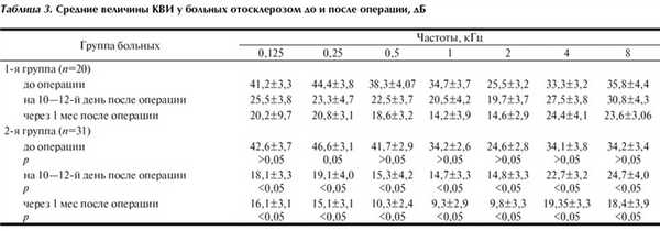 При сравнении средних величин КВИ в дБ по всем частотам аудиометрической тон-шкалы в те же сроки после операции у пациентов 2-й группы, которым было сделано большее отверстие в основании стремени и соответственно использован большего диаметра поршневой протез, с таковыми у пациентов 1-й группы, где был использован меньший диаметр протеза стремени, выявлено, что средние величины КВИ в дБ после операции у пациентов обеих групп статистически достоверно (р≤0,05) меньше по сравнению с дооперационным уровнем (табл. 3).