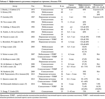 Таблица 3. Эффективность различных операций на стремени у больных ТСК Примечание. PORP — partial ossicular reconstruction prosthesis (частичный протез цепи слуховых косточек); TORP — total ossicular reconstruction prosthesis (полный протез цепи слуховых косточек). При этом лучшие результаты отмечаются после стапедотомии (у 37,5—78% пациентов) и стапедэктомии (у 25—87,5% пациентов) в сравнении с мобилизацией стремени (у 30,8—72% пациентов) [1, 2, 5—7, 16—25].