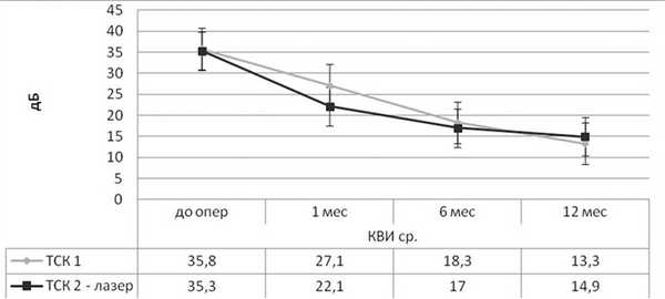 В результате анализа динамики усредненного КВИ (до операции 35,3±8,6 дБ) в подгруппе ТСК2 было отмечено его уменьшение через 1 мес после операции до 22,1±9,5 дБ, через 6 мес — до 17±8 дБ и через 1 год — до 14,9±7,4 дБ. Стапедопластика с лазерной ассистенцией была эффективна во всех сроках наблюдения, но наилучшие результаты отмечены через 6—12 мес после операции. КВИ