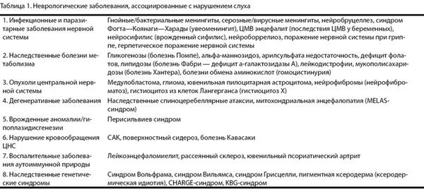 Таблица 1. Неврологические заболевания, ассоциированные с нарушением слуха