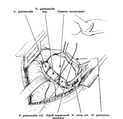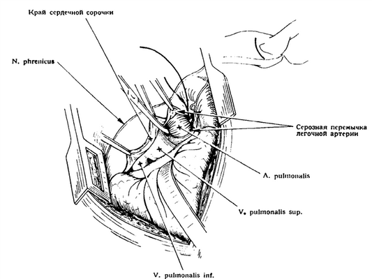 Если возникла необходимость интраперикардиально перевязать все магистральные сосуды легкого и иссечь часть перикарда (например, при обширном прорастании опухолью), то необходим