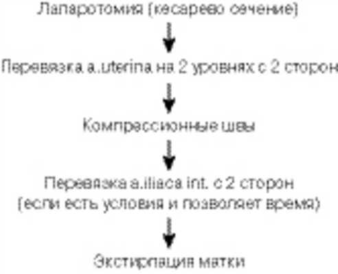 В специальной литературе имеется немало описаний различных вариаций последовательности и техники консервативных методов остановки кровотечения. Так, в стандартах Британского общества акушеров-гинекологов (2009) описан алгоритм хирургической остановки кровотечения, который начинается с наложения компрессионных швов. В случае, если эффект недостаточный и кровотечение продолжается, следующим шагом предлагается перевязка маточных сосудов на двух уровнях или внутренних подвздошных артерий [5].