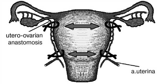 Еще в 1976 г. профессор М.С. Цирюльников провел успешные экспериментальные и клинические исследования по перевязке маточных артерий на 2 уровнях и круглых связок матки с целью остановки акушерских кровотечений. В.М. Орлов и соавт. [1] подтвердили эффективность профилактической перевязки восходящих ветвей маточных артерий и маточно-яичникового анастомоза при консервативной миомэктомии у молодых женщин.