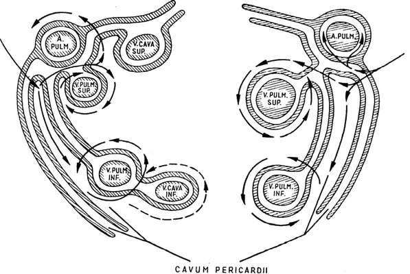 и широкий доступ.Перикард широко вскрывается вдоль диафрагмального нерва.Порядок интраперикардиального выделения магистральных сосудов легкого, их расположение и связь с перикардом схематически представлены нарис. 3-73. На схеме видно, что интраперикардиально магистральные сосуды легкого окружены дуплика-турой серозной оболочки перикарда. Эта дуплика-тура местами натянута в виде перепонки между сосудами внутри общей перикардиальной оболочки.