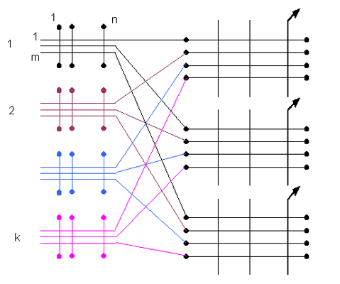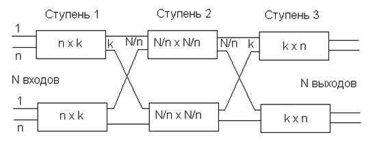 Схема содержит N/n входных и N/n выходных коммутаторов, образующих соответственно первую и третью ступени коммутации. Вторая ступень коммутации состоит из k квадратных коммутаторов с N/n входами и выходами. С помощью ПЛ каждый выход коммутатора первой ступени соединяется с разными коммутаторами второй ступени, так что подключаемый вход соответствует месту коммутатора первой ступени. Иначе говоря, выходы первого коммутатора первой ступени подключаются к первым входам коммутаторов второй ступени, выходы второго коммутатора - ко вторым входам всех коммутаторов второй ступени и так далее. Аналогично соединяются через ПЛ выходы коммутаторов второй ступени со входами коммутаторов третьей.