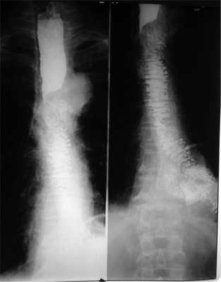 Рис. 1. Рентгенограмма внутриплеврального пищеводно-тонкокишечного анастомоза.