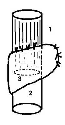 Выделена петля тощей кишки, пересечена, сформирован Y-образный анастомоз по Ру двухрядным узловым швом. Для создания трансплантата достаточной длины пересечено 2 радиарных сосуда первого порядка.