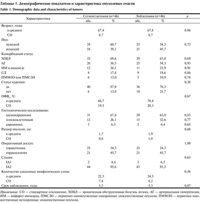 Таблица 1. Демографические показатели и характеристика опухолевых очагов Примечание. СО — стандартное отклонение, ХОБЛ — хроническая обструктивная болезнь легких, АГ — артериальная гипертензия, ИМ — инфаркт миокарда, ПМСЗО — первично-множественные синхронные злокачественные опухоли, ПММЗО — первично-множественные метахронные злокачественные опухоли.