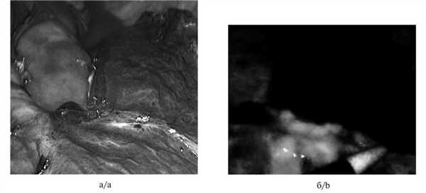 Рис. 4. Интраоперационная фотография определения межсегментарных границ при сегментэктомии SVI левого легкого в обычном свете (а) и ближнем инфракрасном диапазоне (б). Такой способ не требует вентиляции оперируемого легкого, что значительно улучшает визуализацию при торакоскопии, особенно в случаях выраженной эмфиземы легких.