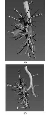 Рис. 1. 3D-компьютерные томограммы бронхососудистых структур. 1 — бронхиальное дерево, 2 — легочные вены, 3 — легочные артерии, 4 — опухоль. а — опухоль располагается в переднем сегменте верхней доли (SIII) левого легкого, артериям A1+2 и A3 присвоены отдельные цвета; б — опухоль располагается в медиобазальном сегменте нижней доли (SX) левого легкого, артериям A8, A9 и A10 присвоены отдельные цвета.
