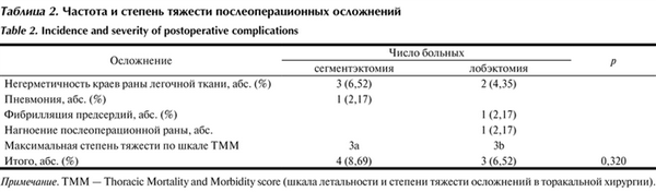 Летальных исходов не было в обеих группах. Осложнения не превышали уровня 3а по системе TMM (Thoracic Mortality and Morbidity score) и зареги-стрированы у 4 (8,69%) и 3 (6,52%) больных в группе сегментэктомии и лобэктомии соответственно без статистически достоверного различия (p=0,320) (табл. 2).