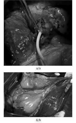Рис. 2. Интраоперационные фотографии вентиляционной методики определения межсегментарных границ. а — инсуффляция воздуха в просвет сегментарного бронха через катетер Фолея, б — разметка границы удаляемого сегмента, заполненного воздухом. Удерживая катетер пинцетом или мягким зажимом для предотвращения дислокации в просвет бронха, по каналу катетера производили инсуффляцию воздуха посредством инсуффлятора, шприца Жане или медицинской груши. Расправляясь, наполненный воздухом сегмент приобретал розовую окраску, более светлую по сравнению с окружающей ателектазированной легочной тканью. При этом определялась четкая инфляционно-дефляционная линия, соответствующая межсегментарной плоскости (см. рис. 2, б).