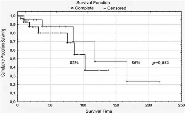 Пятилетняя выживаемость больных, перенесших сегментэктомию и лобэктомию по поводу НМРЛ IA1—2-й стадии с размером опухоли менее 2 см, оказалась сопоставимой и составила соответственно 82 и 86%, статистически значимого различия не отмечено (p=0,652) (рис. 5).