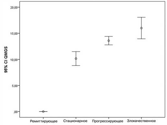 В связи с тем, что миастения является хронической патологией и требует длительного лечения симптоматическими и патогенетическими средствами, особое внимание было уделено клиническим характеристикам заболевания. Общий балл шкалы QMGS варьировал от 0 до 21. Выявлено, что при ремиттирующем течении балл по шкале составлял 0, при стационарном 10±4,04, при прогрессирующем — 13,58±2,39, а при злокачественном — 16,0±3,4 (рис. 1). В результате проведенного однофакторного дисперсионного анализа определено, что дисперсия между средними значениями шкалы QMGS в группах вариантов течения миастении в 87,364 раза выше, чем внутригрупповая дисперсия (F=87,364; p<0,0001).