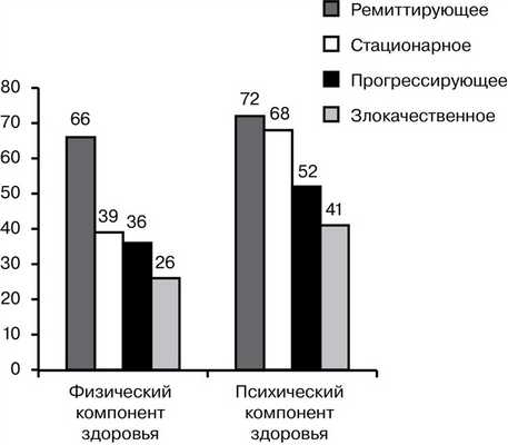 По результатам корреляционного анализа по коэффициенту Спирмена установлена связь клинических факторов с качеством жизни. С суммарными оценками опросника SF-36 связаны степень тяжести заболевания (r=-0,41), характер течения (r=-0,21), длительность (r=-0,47), возраст дебюта заболевания (r=-0,29), уровень значимости составил р