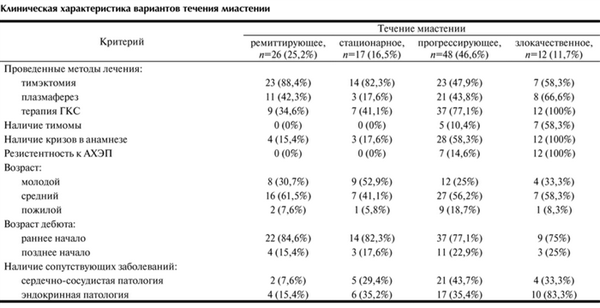 Основные клинические показатели при различных вариантах течения миастении приведены в таблице.