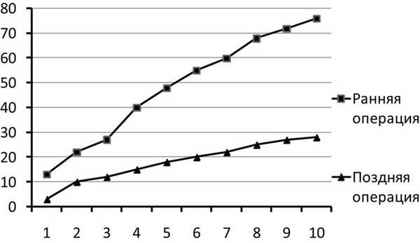 Рис. 2. Распределение пациентов в ремиссии после тимэктомии в зависимости от длительности болезни к моменту операции. По оси абсцисс — годы после операции, по шкале ординат — количество больных в ремиссии. Ранняя операция — операция, выполненная в течение первых 2 лет от момента дебюта заболевания, поздняя — выполненная пациентам с длительностью болезни более 2 лет.