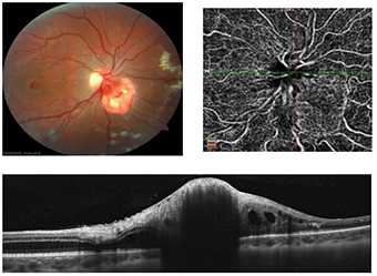Радиационную или лучевую макулопатию относят к непролиферативной ретинопатии [14]. Лучевая макулопатия может манифестировать в виде макулярного отека, при просачивании жидкой фракции крови через стенку поврежденных капилляров (рис 1, 2) или как ишемия макулярной зоны, если поражаются преимущественно перифовеальные капилляры [14].