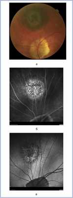 Рис. 7. Фотография (а) глазного дна и ФАГ (б) больной Л., 56 лет. Диагноз: начальная меланома.