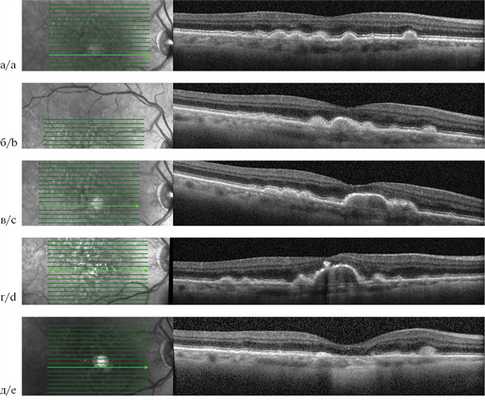 Жизненный цикл друзеноидной отслойки ретинального пигментного эпителия сетчатки от мягких друз до географической атрофии: а — 2013 г.; б — 2014 г.; в — 2015 г.; г — 2017 г.; д — 2018 г.