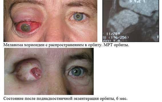 В случае начала лечения меланомы на ранних стадиях применяют органосохранное оперативное вмешательство с удалением лишь пораженного опухолью участка. Более развитой процесс, по показаниям, может потребовать энуклеации или экзентерации орбиты. Хирургические методы, при этом, сочетаются с химио- и лучевой терапией.