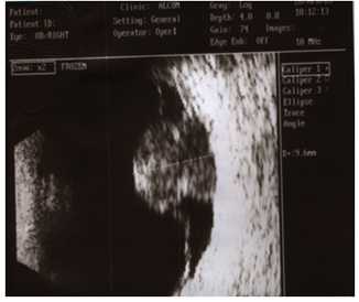 2. Ультразвуковое исследование - ведущий метод диагностики опухолей глаза. Методика проведения контактная и безболезненная. Сканирование позволяет «увидеть» опухоль при непрозрачных средах глаза, установить ее размеры.