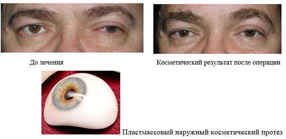 Лечение проводится в условиях комбинированного обезболивания, в осложненных случаях - под наркозом. Длительность лечения - 40-60мин. Подбор первичного (временного) наружного протеза проводится уже при выписке пациента из стационара (на 4-7 день после операции). Памятка для пациентов по уходу за глазным протезом. Подбор постоянного наружного протеза проводится через 3-4 мес (после полного рассасывания отека) при самостоятельном обращении пациента на фабрику глазного протезирования в г. Москве либо по месту жительства.