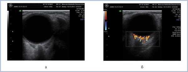 Рис. 9. Дуплексное сканирование левого глаза и орбиты через 6 мес после ПХТ. Определяется уменьшение размеров опухолевой ткани в В-режиме (а), сохранность собственной васкуляризации в режиме ЦДК (б).
