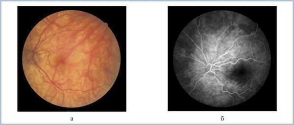 Рис. 2. Офтальмоскопическая картина (а) и флюоресцентная ангиограмма (б) глазного дна левого глаза.