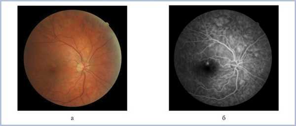 Рис. 3. Офтальмоскопическая картина (а) и флюоресцентная ангиограмма (б) глазного дна правого глаза.