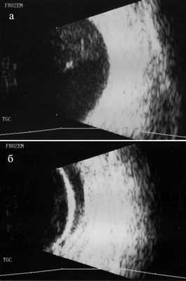 Ультразвуковое исследование глазных яблок в режиме «general» и «vitreous»: OD - в стекловидном теле участок повышения эхо-сигнала, сетчатка прилежит. OS - тотальная отслойка сетчатки с утолщением оболочек глаза. Инфильтрация стекловидного тела отсутствует (рис. 5). Рисунок 5. Рис. 5. В-сканы глазных яблок в витреальном режиме: небольшой участок повышения эхо-сигнала в стекловидном теле правого глаза (а); субатрофия глазного яблока, отслойка сетчатки, утолщение оболочек левого глаза (б).