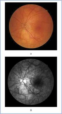 Рис. 8. Офтальмоскопическая картина (а) и флюоресцентная ангиограмма (б) глазного дна правого глаза через 6 мес после ПХТ.