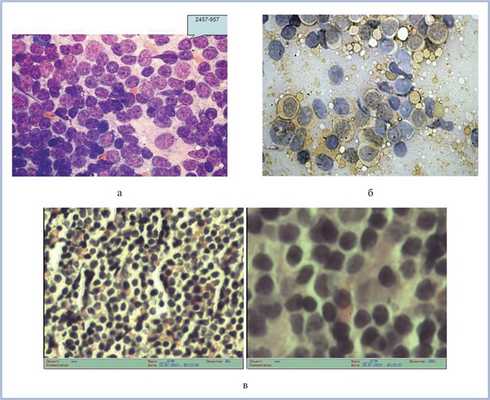Рис. 6. Морфологическая картина. а — результат цитологического исследования. Обилие пролимфоцитов. Окраска по Паппенгейму. Ув. 1000; б — результат иммуноцитохимического исследования. Выраженная положительная реакция на CD20 (коричневое окрашивание); в — гистологический препарат. Окраска гематоксилином и эозином. Ув. 100 и 400. Разрастание лимфоидных клеток средних размеров (в 1,5 раза крупнее малых лимфоцитов) с ядрами округлой и неправильной формы, дифференцируются немногочисленные клетки более крупных размеров.
