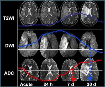 Когда мы сравниваем результаты на T2WI и DWI во времени, мы заметим следующее: В острой фазе T2WI норма, но со временем зона инфаркта станет гиперинтенсивной. Гиперинтенсивность на T2WI достигает своего максимума между 7 и 30 дней. После этого сигнал начинает угасать. На DWI гиперинтенсивная область в острой фазе, а затем становится более интенсивной с максимумом на 7 дней. На DWI у пациента с инфарктом головного мозга визуализируется гиперинтенсивная область примерно на 3 недели после начала заболевания (при инфаркте спинного мозга на DWI визуализируется гиперинтенсивная область на одну неделю!). На ADC будет сигнал низкой интенсивности с минимальной интенсивностью в первые 24 часа, после сигнал будет увеличиваться в интенсивности и, наконец, становится максимально интенсивным в хроническую стадию.