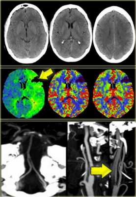 Было проведено исследование для сравнения КТ и МРТ, при котором было установлено, что для выполнения КТ, КТА и КТП при условии, что у вас хорошо сложенная команда, требуется 15 минут. В данном случае была выполнена только КТ так, как выявлено кровоизлияние. В этом случае изначально выполнены КТ без контрастирования и КТ-перфузия так, как выявлен дефект перфузии было целесообразно выполнение КТ-ангиографии, на которой выявлено диссекция левой внутренней артерии.