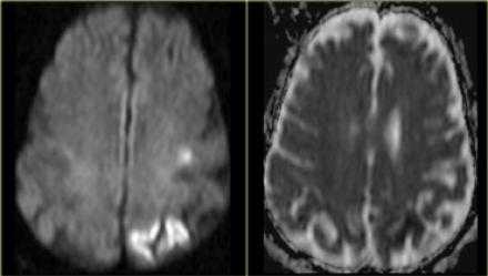DWI наиболее чувствительна к инсульту. В результате цитотоксического отека возникает дисбаланс внеклеточной воды к Броуновскому движению, поэтому данные изменения выявляются отлично на DWI. В норме протоны воды диффундируют внеклеточно, поэтому теряется сигнал. Высокая интенсивность сигнала на DWI указывает на ограничение протонов воды диффундировать внеклеточно.