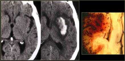 При развитии очага некроза определяют расположение, размеры, степень поражения церебрального вещества.